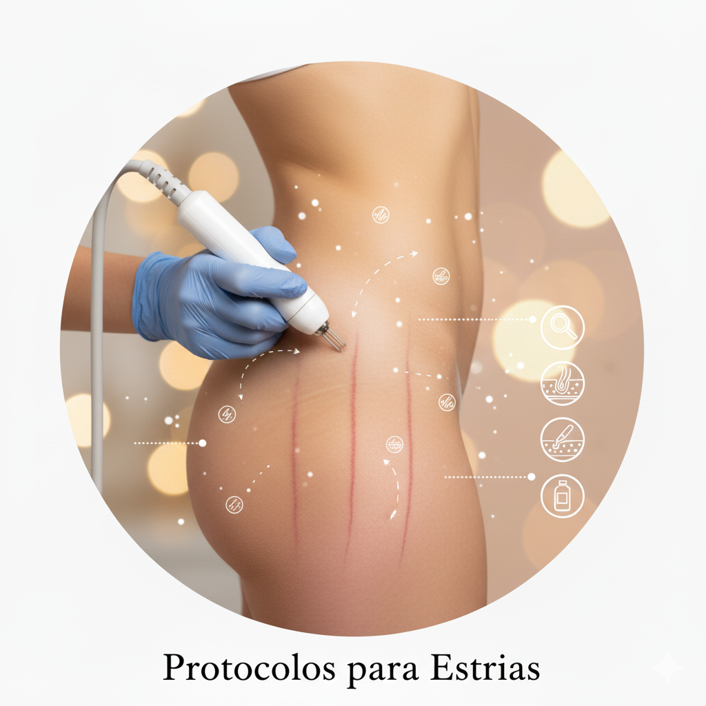 O tratamento para estrias visa melhorar a aparência das marcas, estimulando a regeneração da pele e a produção de colágeno. O protocolo ideal é definido de acordo com o tipo de estria (vermelha, roxa ou branca) e sua profundidade.